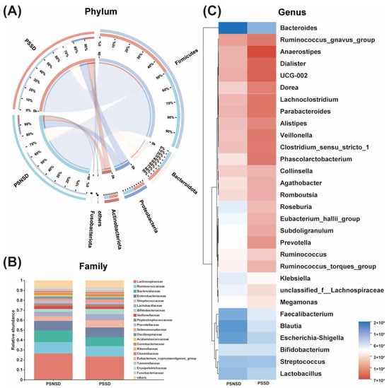 Alterations in the composition of gut microbiota in patients with PSSD. (A) Distribution of the microbial community for each group at the phylum level. (B) Average relative abundances of microbial community composition for each group are shown by bar plots for the family level. (C) Heatmap of gut microbiota composition at the genus level for the PSSD and PSNSD groups. PSSD: Post-stroke sleep disorder; PSNSD: Non-sleep disorders after stroke.