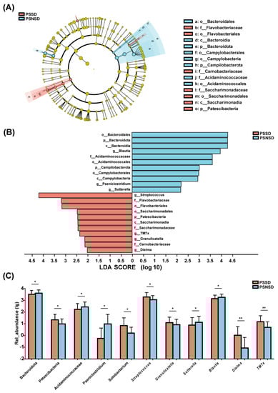 LEfSe analysis of taxonomic biomarkers of gut microbiota. Cladogram showing the phylogenetic relationships of the bacterial taxa and Linear discriminant analysis (LDA) scores between the PSSD and the PSNSD groups (A,B). The relative abundance of gut microbiota at the phylum, family, and genus level. (C) Differences were assessed by rank sum test and denoted as follows: the relative abundances of the significant bacteria at the phylum level, the Familyand the genus level in PSSD patients compared with PSNSD patients. * p < 0.05 and ** p < 0.01. PSSD: Post-stroke sleep disorder; PSNSD: Non-sleep disorders after stroke.