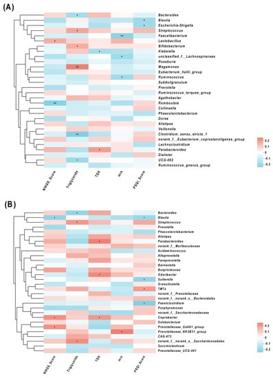 Correlations of the relative abundance of gut microbiota and clinical characteristics, (A) and (B) between clinical parameters and gut microbiota were analyzed using Spearman’s analysis (heatmap). The x-axis represents the clinical parameters. The y-axis represents gut microbiota in the top 30 in terms of abundance (A) and the gut microbiota with differential abundance (B). The colors of the grids represent the correlation analysis value of Spearman’s correlation analysis. Grids in red indicate positive correlations (correlation analysis value more than 0.1), while grids in blue indicate negative correlations (correlation analysis value less than −0.1). The color-coded scale indicates the correlation analysis value from the heatmap; deeper red or blue indicates higher correlation values. * p < 0.05 and ** p < 0.01.