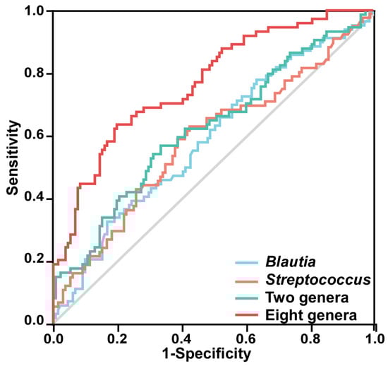 ROC curves are demonstrated based on the relative abundance of the eight characteristic genera in discriminating PSSDs from PSNSDs. Each curve in the figure represents the ROC curve of the best model using different microbiota combinations: Blautia alone (AUC = 0.590, 95% CI: 0.509–0.671, p = 0.032), Streptococcus alone (AUC = 0.588, 95% CI: 0.505–0.671, p = 0.036), combination of two genera (Blautia and Streptococcus), and combination of eight genera (Streptococcus, TM7x, Granulicatella, Dielma, Blautia, Paeniclostridium, Sutterella, and Blautia).