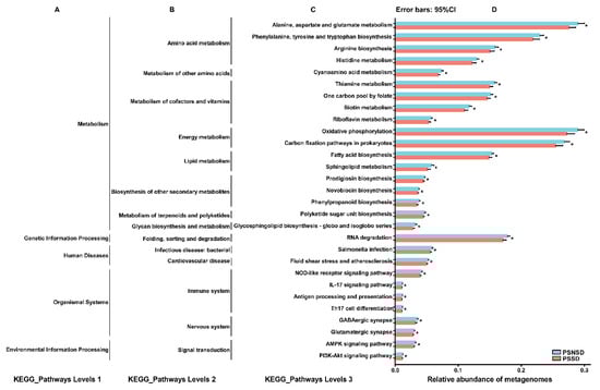 Relative abundance of the KEGG pathways of functional categories in the gut microbiota between the PSSD group and the PSNSD group. (A). KEGG_Pathways Levels 1; (B). KEGG_Pathways Levels 2; (C). KEGG_Pathways Levels 3; (D). Relative abundance of metagenomes. Significant differences in KEGG pathways at level 3 were detected using SPSS software based on the KEGG pathway database. * p < 0.05.