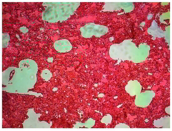 The lungs were macroscopically changed and showed increased cohesiveness. In practically all cases, the lung parenchyma was massively hyperaemic, showing increased fragility on palpation. On the surface of the lungs, there was a slight localized dark-colored edema (dotted pattern) characteristically intersecting the surfaces (Figure 1), with small hemorrhages in some places (Figure 2).
