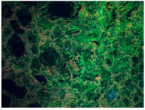 Fibrosis of the lung tissue as a result of a chronic inflammatory process. Visualization using a Zeiss multi-channel microscope (Filter set 25 Zeiss, Excitation TBP 400 + 495 + 570, Emission TBP 460 + 530 + 625). The greenish-gray structures visible in the figure are fibrotic lung tissue. (Source: Prof. Mirosław Parafiniuk).