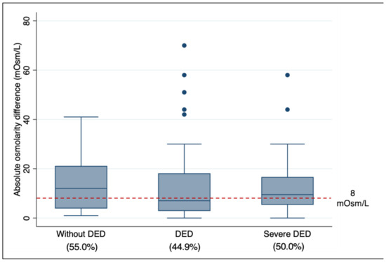 Absolute inter-eye osmolarity difference in mOsm/L comparing patients without DED, with DED, and with severe DED. Red dashed line shows the proposed cut-off inter-eye difference of 8 mOsm/L to differentiate between DED and non-DED patients. Percent under labels are the proportion of patients with an inter-eye difference >8 mOsm/L in each group.