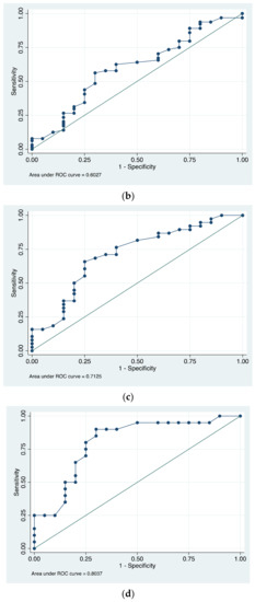 ROC curves that show the discriminative capacity of tear meniscus osmolarity for DED and DED subtypes. (a) The area under the curve (AUC) was low for DED and for each subtype; (b) evaporative DED and (c) aqueous-deficient DED; (d) being only acceptable for severe DED.