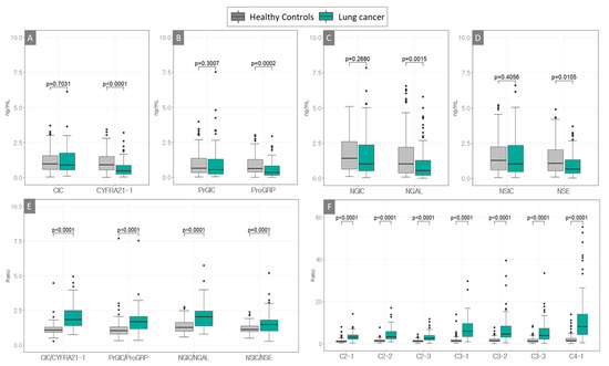 Boxplots used to distinguish patients with lung cancer (non-small cell lung cancer) and the healthy controls using four protein markers, including antigen–autoantibody immune complexes and their free antigens (A–D), their ratios (E) and combination ratios of two to four markers (F), including (A) CIC and CYFRA21-1, (B) ProGIC and ProGRP, (C) NGIC and NGAL, and (D) NSIC and NSE. Combinations of the ratios (E) CIC/CYFRA21-1, PrGIC/ProGRP, NGIC/NGAL, and NSIC/NSE and (F) C2-1 (CIC/CYFRA21-1 × PrGIC/ProGRP), C2-2 (CIC/CYFRA21-1 × NGIC/NGAL), C2-3 (CIC/CYFRA21-1 × NSIC/NSE), C3-1 (CIC/CYFRA21-1 × PrGIC/ProGRP × NGIC/NGAL), C3-2 (CIC/CYFRA21-1 × NGIC/NGAL × NSIC/NSE), C3-3 (CIC/CYFRA21-1 × PrGIC/ProGRP × NSIC/NSE), and C4-1 (CIC/CYFRA21-1 × PrGIC/ProGRP × NGIC/NGAL × NSIC/NSE) (patients with non-small cell lung cancer, n = 85; healthy controls, n = 120).