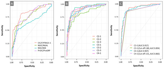 Receiver operating characteristic (ROC) curves: (A) ROC curve analysis with the ratios of autoantibody immune complexes to their free antigens (CIC/CYFRA21-1, PrGIC/ProGRP, NGIC, NGAL, NSIC, and NSE); (B) ROC curve analysis comparing seven combinations comprising two to four markers, including CIC/CYFRA21-1 (C2-1, C2-2, C2-3, C3-1, C3-2, C3-3, and C4-1); (C) comparison of ROC curves for C3-1 and C4-1. Abbreviations: CIC, CYFRA21-1-Anti-CYFRA21-1 autoantibody immune complex; PrGIC, ProGRP-Anti-ProGRP autoantibody immune complex; NGIC, NGAL-Anti-NGAL autoantibody immune complex; NSIC, NSE-Anti-NSE autoantibody immune complex.