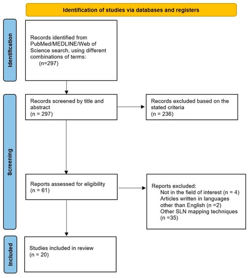 Among the 297 articles identified after the first search, 61 studies were assessed for eligibility based on the stated inclusion criteria, and 20 studies were finally selected for this qualitative synthesis. Data extracted from each publication included the authors, research design, study reasons, imaging techniques, number of enrolled patients, status of lymph nodes before and after treatment, results of SLN mapping, the rate of SLN identification and study results. A descriptive overview was performed to provide key summary statistics of the information obtained from the papers.