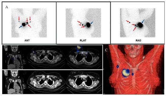 Female patient aged 45 years old diagnosed with Stage II invasive ductal carcinoma of the breast. (A) Planar lymphoscintigraphy showed multiple SLNs (red arrows) localised in different lymph node levels and overlapping the injection site (blue arrow). (B) For more precise localisation of the SLNs, the patients underwent SPECT/CT examination that revealed lymphatic drainage originating from the peritumoural region into the right axillary region (involving 1 SLN) and the bilateral internal mammary regions (involving two nodes on the right side and one on the left side). Figure (C) shows a 3D rendering of the SLNs positions.
