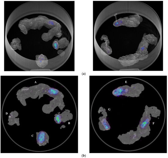 (a) Volumetric rendering and axial view (b) of 68Ga-PSMA-11 PET/CT specimen images of the pelvic lymph nodes of a high-risk prostate cancer patient undergoing robot-assisted radical prostatectomy (RARP) and pelvic lymph node dissection (PLND). A, B: left obturator, C: left proximal external iliac, D: left distal external iliac, E: right distal external iliac, F: right obturator, G: right proximal external iliac.