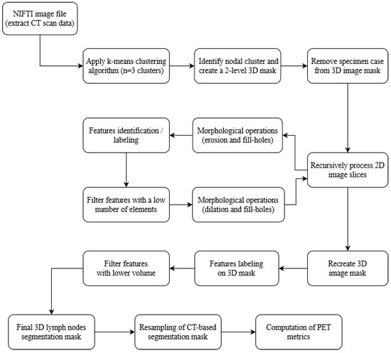 The automatic segmentation of nodal structures was performed using only open-source Python libraries, such as NiBabel, Scikit-learn, SciPy and Scikit-image. The intraoperative PET/CT images proved to be a suitable setting for the application of automated segmentation based on machine learning due to the simplified anatomical context of the surgical specimens. The main steps of the segmentation model are described below.