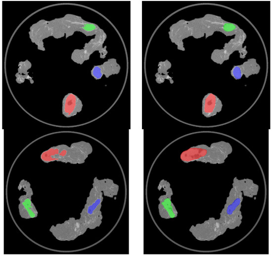 Axial images showing the outcome of the automatic (left) and manual (right) segmentation of the 68Ga-PSMA-11 PET/CT nodal specimen images. Top row: left pelvic lymph nodes. Bottom row: right pelvic lymph nodes.