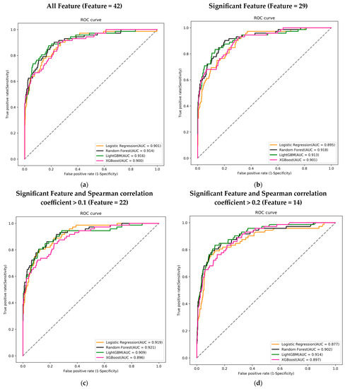 Among the 42 features, the LightGBM model performed the best with an AUC of 0.916. In the combination of 29 features, the Random Forest model achieved the highest AUC of 0.918. For the 22-feature combination, the Random Forest model again outperformed others with an AUC of 0.921. Lastly, in the combination of 14 features, the LightGBM model had the highest AUC of 0.914 (Figure 3a–d).