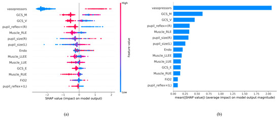 We ranked the significance of all variables in the LightGBM model to comprehend the role of each better (Figure 4). In Figure 4a, the color of the SHAP plot represents the size of the original feature values, with red indicating positive variable values and blue indicating negative ones. The SHAP value signifies the degree of a feature’s impact on the outcome (a positive SHAP value indicates a positive effect). A wider Feature SHAP value suggests a more extensive influence on the outcome. As depicted, patients using vasopressors (represented by red dots) have an increased risk of death (SHAP value is positive), whereas the impact of GCS_M and GCS_V is the opposite. Figure 4b displays the ranking of features’ influence on the outcome based on the absolute values of the SHAP values. The figure shows that the top five influential feature variables are vasopressors, GCS_M, GCS_V, pupil reflex + (R), and Muscle_RLE.
