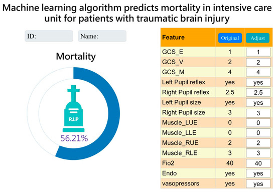 After a series of analyses, we concluded that the LightGBM model with a combination of 14 features was more lightweight. Therefore, we integrated it into the hospital system to assist clinical doctors and nurses in treatment and facilitate communication with patients’ families. The “Original” column represents data for current status. Currently, it displays data from the time of admission to the ICU. The “Adjust” column allows the observer to adjust the values of each feature to understand the effect of each feature on the risk of mortality as a reference for treatment. (Figure 5).