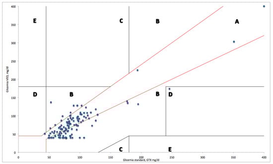 The most important factor for determining the safety of the instrument is to find the values distributed in the A and B regions. The graph shows the CGMS to be safe, but it tends to overestimate the condition of hypoglycemia, as many values in the B region are lower than 47 mg/dL in the CGMS while they are higher in the GTX evaluation.