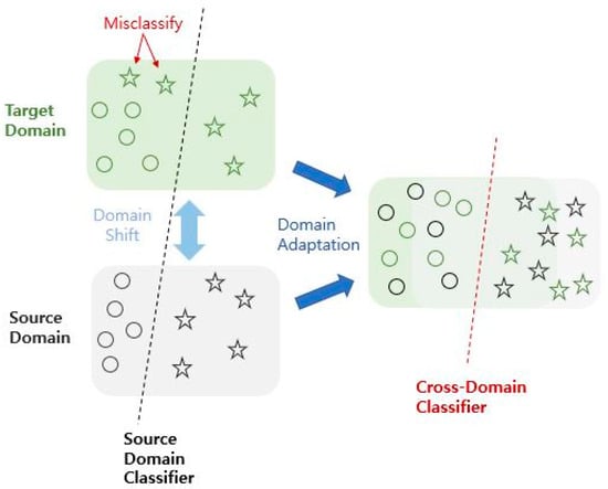 GANs have had a significant impact on the field of AI by transforming supervised-learning-oriented deep learning systems into unsupervised learning. Previously, learning was possible only when all data were correct. However, the emergence of GANs, which can continuously generate new data without correct answers, has opened up new possibilities for AI; these include image generation and restoration, domain transformation, object detection, super resolution, and music generation. Domain adaptation refers to the adaptation of information from existing domains to new domains that are different but relevant. Here, the two main domains are divided into source and target domains and are assumed to have different dataset distributions (Figure 1) [7]. If the model learned from the source domain is to be applied to the target domain, a problem inevitably arises because the two domains have different distributions, which are usually referred to as “domain shifts”. Therefore, the goal of domain adaptation is to create a more robust model for these domains to prevent domain shifts.