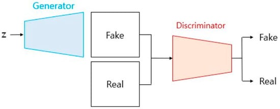 A generative adversarial network, or GAN, is a network in which constructors and identifiers compete with each other and generate data. The goal of a GAN is to generate data close to the distribution of the real data, and the generator attempts to generate fake data close to the real data so that the discriminator does not falsely discriminate (Figure 2). The goal of this process is to gradually improve the performances of the generator and discriminator and ultimately prevent the discriminator from distinguishing between real and fake data [18].