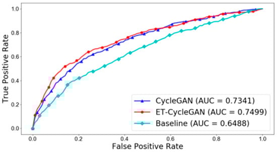 Pons et al. determined the performance before and after domain adaptation using a receiver operating characteristic curve (Figure 3) [19]. The performance of the baseline image before domain adaptation was extremely poor (area under the curve (AUC), 0.6488). After the domain adaptation with CycleGAN, the true positive rate of the image was significantly improved (AUC, 0.7341).