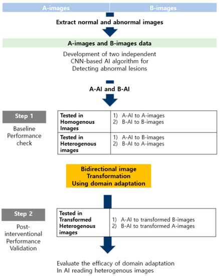 We recently conducted a domain adaptation study using WCE. The latest AI models for automated WCE reading are useful with respect to reductions in reading time [22,23,24]. In addition, we used AI for automated abnormal lesion detection in small bowel WCE and found that the performance of the AI-assisted interpretation was comparable with that of experienced endoscopists for abnormal lesion detection without improvement. However, the performance of the optimized WCE AI algorithm deteriorated when it was applied to data from other hospitals. In addition, our previous study showed that a binary classification model (two categories of images: clinically insignificant images, including normal mucosa, bile, air bubbles, and debris; and significant lesion images, including inflammation, abnormal vascular lesions, and bleeding) produced excellent outcomes in an internal hospital test, with a high sensitivity even in unseen images. Unfortunately, this model showed subclinical outcomes in an external test at a third-party hospital. This phenomenon is also commonly experienced in AI applications to other images in real-world situations. This constitutes a major obstacle to the universal use of AI in medical fields. The domain shift problem has been also observed in WCE. AI engineers have adopted the domain adaptation technique to enable efficient algorithm learning by creating new virtual data and extracting the main features of a collected image. An A-image and a B-image are handled separately and divided into training and validation (test) sets. Two independent AI algorithms (A-AI and B-AI) are built using the training images from the two groups. These are trained to discriminate between normal and significantly abnormal images. After the training, each AI algorithm is applied to a homogeneous test set. These algorithms are then tested using a heterogeneous test set (e.g., applying A-AI to the B-image test set, or applying B-AI to the A-image test set) to determine whether the performance improves or deteriorates. Their performances are evaluated using heterogeneous test images after several up-to-date domain adaptation techniques are applied to the test images. Thus, we attempted to evaluate the extent to which the domain adaptation technique can improve the reading accuracy in heterogeneous images (Figure 4). We tested three different domain adaptation architectures, introduced from 2017 to present: CycleGAN, discoGAN, and MUNIT. These domain adaptation methods enable the original images of WCE to be transformed and reconstructed into a new image to match the distribution of the target domain. This process allows the newly created image to possess a style similar to the heterogenous capsule image. We also compared various domain adaptation techniques for an EfficientNet-based algorithm and ResNet-based algorithm. We found that the domain adaptation was effective regardless of the algorithm used. In addition, domain adaptation using CycleGAN resulted in an additional AI performance improvement. A similar improvement in terms of performance improvement was obtained using discoGAN. The improvement in terms of efficacy outcome was the greatest when the domain adaptation was performed with CycleGAN.