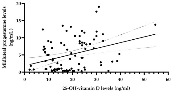 Relationship between serum 25-OH vitamin D levels and mid-luteal progesterone levels in 86 patients with infertility of unknown etiology. The solid line represents the regression line; the dotted lines represent the confidence interval of 95%. Correlation coefficient = 0.28 (p < 0.01), 95% CI 0.07–0.47.