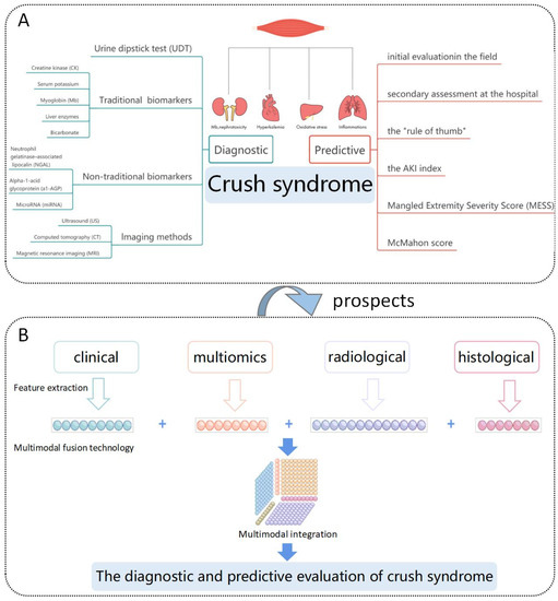Rhabdomyolysis is the core component of CS, and the toxic effects of muscle cell contents can involve multiple organs, such as the kidneys, heart, and lungs, leading to a series of complications, such as acute kidney injury (AKI), hypovolemic shock, hyperkalemia, acute respiratory distress syndrome (ARDS), and diffuse intravascular coagulation (DIC) [43]. Since CS involves more than just muscles, systemic effects on organs also occur. When assessing biomarker levels, it is important to pay attention not only to muscle damage but also to the various complications associated with CS. The in-hospital diagnosis of CS has long been a nonissue; however, the question of how to rapidly identify high-risk patients in the face of large volumes of casualties in a chaotic prehospital setting still needs to be addressed. This review summarizes the common screening methods, conventional and emerging biomarkers, diagnostic imaging tools, and various predictive scoring systems for CS. Other than NGAL, which has been promoted and applied in some hospitals, other potential markers, such as a1-AGP and miRNAs, are still in the preclinical research stage and have not been applied in clinical practice; however, they may lead to the development of attractive diagnostic tools in the future. Currently, the diagnosis of CS cannot be achieved by a single test, and the various scoring systems that have been developed also have many shortcomings (Table 1 and Figure 1A).