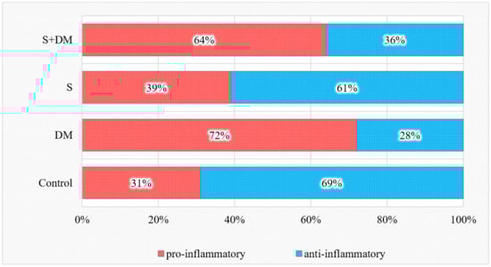 The proportion of pro-inflammatory cytokines was elevated in the diabetic non-smoking group and decreased in the smoking group. At the same time, the ratio of anti-inflammatory cytokines in relation to all 18 studied cytokines was increased in smokers and decreased in both diabetic groups versus those in the controls (p < 0.05).