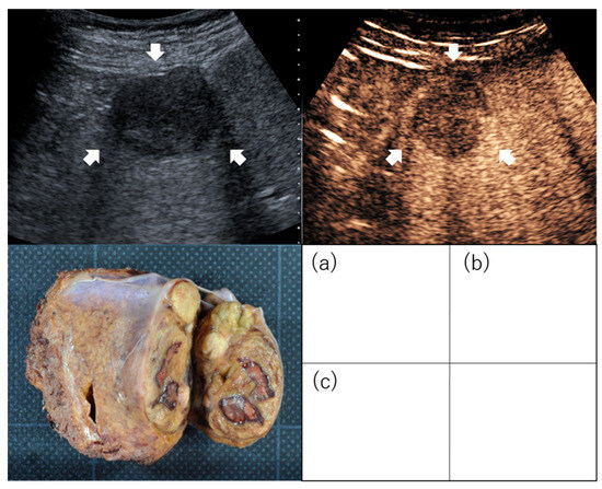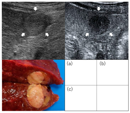 Images of irregularly shaped hepatocellular carcinoma on contrast-enhanced ultrasound. Images of confluent multinodular type: Hepatocellular carcinoma (3 cm, segment 4) was evaluated as an irregular type by conventional B-mode ultrasound (a) and as irregular type in the post-vascular phase of contrast-enhanced ultrasound (b). Examination of the resected specimen identified the mass as confluent multinodular type (c). Arrows indicate the tumor.