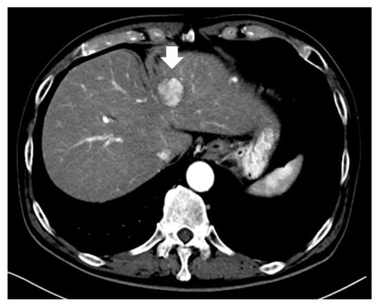 A typical small hepatocellular carcinoma (3.0 cm) showing arterial heterogeneous tumor enhancement on contrast-enhanced computed tomography (arrow indicates tumor).