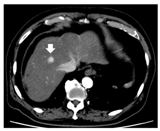 Representative small hepatocellular carcinoma (2.0 cm) shows arterial homogeneous tumor enhancement on contrast-enhanced computed tomography (arrow indicates tumor).