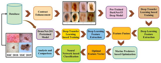In this section, the proposed method for melanoma classification is presented. The proposed method comprises preprocessing, feature extraction and fusion, feature selection, and classification steps. Figure 1 shows the proposed melanoma classification using deep learning. This figure shows that the deep features are extracted from two pre-trained CNN models, DarkNet-53 and DenseNet-201. The extracted deep features are fused using a novel technique that is later optimized using a feature selection algorithm. The selected features are finally employed for the classification. The description of each step is given in the below sub-sections.