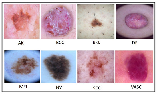 The ISIC2019 [44] dataset comprises 25,331 training images and 8238 test images. Overall, the total number of images is 33,569. This dataset consists of eight classes: MEL, NV, BCC, AK, BKL, DF, VASC, and SCC (squamous cell carcinoma). All images of both datasets have been in RGB format with different resolutions. We resized all the images into 512 × 512 × 3, which was later resized according to the selected CNN models. A few sample images are shown in Figure 2.