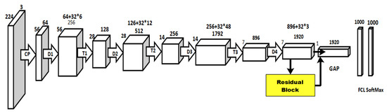 Figure 5 shows the original architecture of DensNet-201. In the fine-tuning process, we replaced the last three layers at the initial stage with three new layers. After that, a residual block of six layers was added, including three convolutional filter sizes 3 × 3 and stride 1. This block is added after the T3. This fine-tuned model is trained using TL, whereas the global average pooling layer is selected for the deep feature extraction. On this layer, 1920 features are extracted for each image.