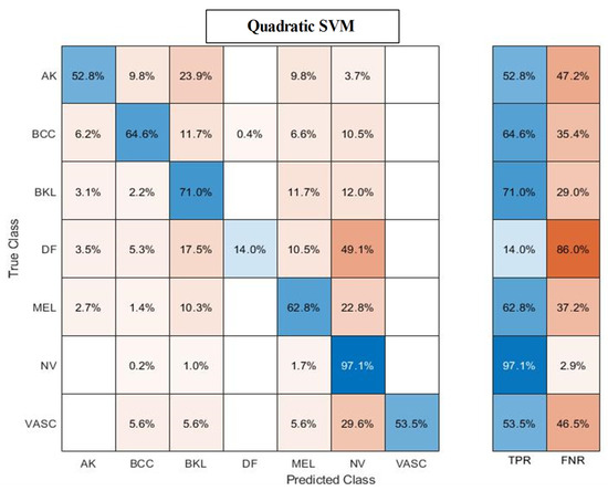 Confusion matrix of Quadratic SVM after employing the proposed feature selection technique on ISIC2018 dataset. * Actinic keratosis (AK), Melanoma (MEL), Melanocytic nevus (NV), Basal cell carcinoma (BCC), Benign keratosis (BKL), Dermatofibroma (DF), and Vascular (VASC), respectively.