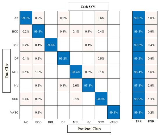 Confusion matrix of Cubic SVM after employing feature selection technique on ISIC2019 dataset.