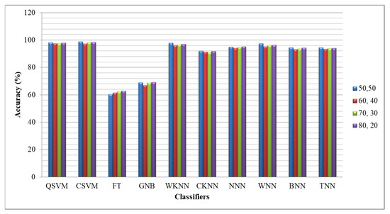Moreover, time is computed for each classifier for all experiments. Based on the noted time in the tables, it is observed that the computational time of the fusion process is significantly increased, which was later reduced by the feature selection technique. Figure 8 shows the accuracy-based comparison of ISIC2019 dataset results after employing the proposed feature selection technique. This figure shows that the accuracy is plotted for four different ratios such as 50:50, 60:40, 70:30, and 80:20, respectively. The average accuracy of all classifiers for the 50:50 approach is 89.81%, whereas for the rest of the combination, the obtained accuracies are 88.68, 89.29, and 89.75%, respectively.