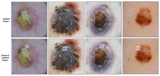 A GradCAM-based visualization is performed for the DenseNet-201 fine-tuned model. This process aims to analyze the newly trained model’s performance. A few sample results are shown in Figure 9. In this figure, it is illustrated that the brown highlighted regions are marked on the cancer region. Figure 10 shows a few sample-labeled images of the entire proposed framework. These images are generated using the proposed method (Cubic SVM classifier). In the end, a brief comparison of the proposed method with several existing techniques has been conducted. Table 10 presents several techniques for comparison with existing methods. In [49], the authors used the ISIC2018 dataset for the experimental process and obtained an accuracy of 83%. The proposed method shows an improved accuracy of 85.4%. Authors in [50,51] used the ISIC2019 dataset and obtained an accuracy of 97.1% and 97.84%, respectively. The proposed method obtained an accuracy of 98.9%, which is improved than the existing techniques on the ISIC2019 dataset.