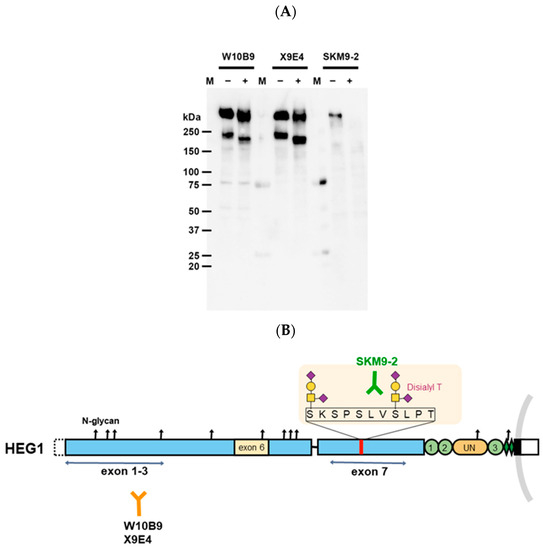 Summary of anti−HEG1 monoclonal antibodies. (A) Western blotting using anti−HEG1 monoclonal antibodies. Cell lysates of ACC−MESO4 were treated with the Protein Deglycosylation Mix II (New England Biolabs Japan, Tokyo, Japan), isolated by sodium dodecyl−sulfate poly-acrylamide gel electrophoresis under nonreducing conditions, and then electrotransferred to a PVDF membrane. Then, the membrane was reacted with each monoclonal antibody (clones W10B9, X9E4, or SKM9-2) and analyzed by Western blotting. W10B9 and X9B4, but not SKM9−2, bound to deglycosylated HEG1. M, protein marker (Precision Plus Protein Dual Color Standards (BioRad)); −, nontreated sample; +, glycosidase-treated sample. (B) Region of HEG1 molecule recognized by each antibody clone. SKM9-2 antibody recognizes both sialylated O-glycans and peptide sequences in the region shown in (B) [14].