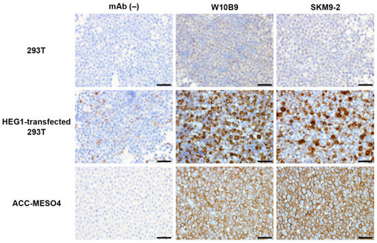Immunostaining using anti-HEG1 monoclonal antibodies. Cells were collected by centrifugation, fixed in 10% neutral buffered formalin, and embedded in paraffin. Four-micrometer-thick sections of cell blocks were used for immunostaining. HEG1-transfected 293T expressed full-length HEG1. W10B9 and SKM9-2 monoclonal antibodies against HEG1 showed similar stainability. More information about monoclonal antibody SKM9-2 is described in ref. (Tsuji S et al. [13] Sci Rep 7: 45768, 2017). Scale bars, 50 µm.