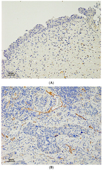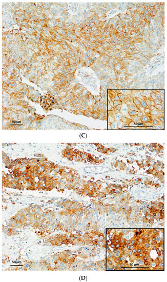 In non-neoplastic urothelial tissues, HEG1 staining was not observed in the urothelial epithelium (Figure 3A). Vascular endothelial cells were positive even when the tumor cells were negative and used as an internal positive control (Figure 3B). HEG1 staining was observed in the membrane and cytoplasm of the tumor cells (Figure 3C,D).