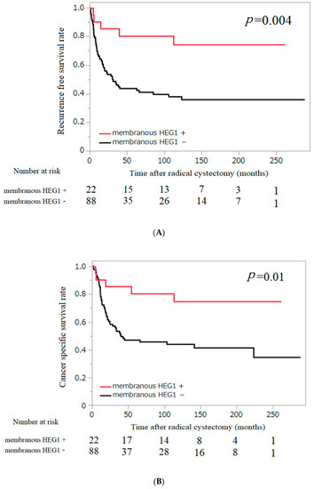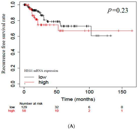 To compare the present immunohistochemical data, we analyzed HEG1 mRNA expression levels in patients with BC using The Cancer Genome Atlas (TCGA) database (Figure 5). TCGA datasets revealed that the group with high HEG1 mRNA expression had significantly shorter OS, but no significant difference in RFS was observed (p < 0.01 and p = 0.23, respectively).