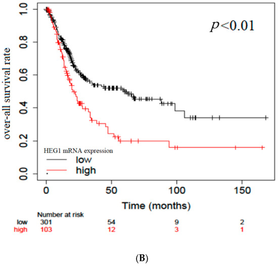 The relationship between HEG1 mRNA expression and survival across various cancers was examined using the Kaplan–Meier plotter (https://www.kmplot/analysis/ (accessed on 10 May 2023)). We investigated the association between HEG1 mRNA expression levels and overall survival (OS) as well as recurrence-free survival (RFS) in BC. Both hazard ratios (HRs) and log-rank p-values were calculated. Patients were divided into two groups according to the best cut-off value of HEG1 mRNA expression.