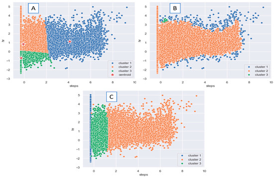 Figure 3 depicts the visualization results of the three chosen clustering algorithms: (A) k-means for the first fold of data RHR with steps, (B) DBSCAN with the same data and with eps = 0.2, and (C) GMM where the number of components equals 3. As we can see in the rightmost part, in the k-means case, the first cluster (i.e., the blue) exhibits higher steps with higher HR values. This is a typical case wherein physical movement induces complementary interaction between the influences of the vagal inhibitory and the increase in sympathetic excitatory influences, and thus, higher RHR values [46,47]. Cluster 3 in k-means appears in the green region and represents relatively low physical activity (i.e., steps) and reduced RHR.