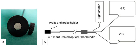 A tungsten–halogen light source (Ocean Optics HL-2000-HP; Ocean Optics, Orlando, FL, USA) delivered a broadband spectrum (about 360–2000 nm) through a custom-designed fibre probe (10 mm in diameter) connected to a custom-made probe holder (25 mm diameter), as seen in Figure 1a. The fibre bundle had a central illuminating fibre (diameter 400 μm) encircled (diameter 5 mm) by ten collecting fibres (diameter 200 μm). Every alternate collecting fibre was attached to a spectrometer operating in the wavelength range of 350–1100 nm (Ocean Optics QE6500-VIS-NIR), and the remaining fibres were attached to a spectrometer operating in the wavelength range of 900–1700 nm (Ocean Optics NIRQuest512). All optical fibres had a numerical aperture of 0.22. The spectrometers’ slits of 50 and 25 μm, respectively, provided optical resolutions of about 3 nm. By using two spectrometers together, spectra were obtained in the range of 450–1550 nm (see Figure 1b) [16]. Both spectrometers enable real-time continuous spectra within their respective detector wavelength ranges. Computer software (Ocean View 2.0, Ocean Insight, Orlando, FL, USA) was used to operate the spectrometers and collect data on a laptop computer.