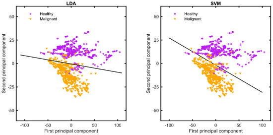 Based on the wavelength range of 450–900 nm, the first two principal components, together, accounted for 83% of the total explained variance in the optical spectrum. When utilising the extended-wavelength range of 450–1550 nm, the corresponding figure was 80%. Whatever wavelength range used, almost all the spectral variation in the entire dataset was captured by the first two principal components. The linear discrimination analysis (LDA) and support vector machine (SVM) discrimination algorithms were used to categorise the samples based on only two principal components (see Figure 4). The score charts for the two first principal components show a clear discrimination between healthy and malignant breast tissue in the extended-wavelength range.