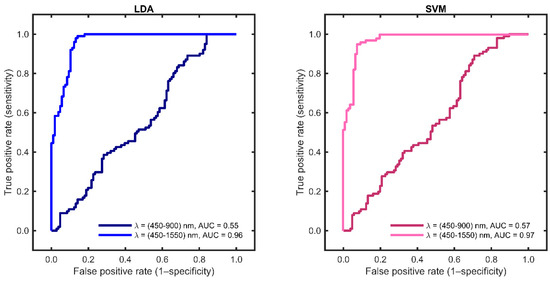 Score plots of two diagnostic parameters (first and second principal components) based on LDA (left) and SVM (right), respectively. LDA, linear discriminant analysis; SVM, support vector machine. The sensitivity (SE), specificity (SP), classification rate (CR), and Matthew’s correlation coefficient (MCC) values obtained using the LDA and SVM algorithms are listed in Table 4. A direct comparison can be made between the standard wavelength range of 450–900 nm and the extended-wavelength range of 450–1550 nm, with the latter showing improved values. The ROC curves and their respective AUCs are shown in Figure 5.