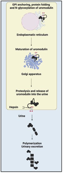 In 1873, an Italian physician named Carlo Rovida (University of Turin, Turin, Italy) discovered a substance produced by tubular cells in the kidney. He observed that this substance, referred to as cilindrina, led to the formation of hyaline casts in the tubular lumen [1]. The Tamm-Horsfall protein, discovered by Tamm and Horsfall in 1950, is the predominant protein excreted in urine by epithelial cells lining the thick ascending limb (TAL) of the loop of Henle (90%) and by epithelial cells of the early part of the distal convoluted tubule (DCT1) (10%) [2,3]. Uromodulin primarily localizes to the apical membrane within TAL epithelial cells, although it has also been observed at the basolateral membrane, which is important for the release of this protein in the renal interstitium and subsequently into the systemic circulation [4,5]. Uromodulin expression gradually increases as the TAL segments mature, ultimately reaching its peak level after birth. Uromodulin excretion demonstrates a gradual increase from birth to adulthood [6], stabilizes during the adult years [7,8,9,10], and subsequently starts to decline after the age of 60 years [11,12]. Moreover, it has been documented that this protein can interact with and impede viral hemagglutination [2,3]. Muchmore and Decker made significant discoveries in 1985. They found that an 85 kDa glycoprotein extracted from the urine of pregnant women possessed the remarkable capability to inhibit antigen-induced T-cell proliferation and monocyte cytotoxicity when tested in vitro, for which it was named uromodulin [13]. Subsequently, Pennica et al. determined through sequence analysis that Tamm-Horsfall protein and uromodulin are identical proteins [14]. Uromodulin is only detected in the kidneys, excreted into both the urine and interstitium, and circulates in the bloodstream [4,15,16]. Water loading leads to an increase in the secretion of polymerizing urinary uromodulin. This heightened secretion contributes to a decrease in the variability of urinary uromodulin concentrations, even when dealing with high urine volumes [17]. In various forms of kidney disease, interstitial uromodulin is closely correlated with serum uromodulin concentrations, although there is a concentration gradient between the medulla and cortex of the kidney [4].