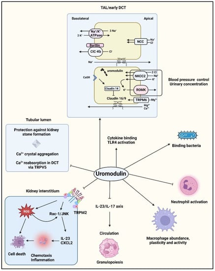 In the renal interstitium, uromodulin exhibits the ability to interact with multiple cell types present in this microenvironment. Uromodulin effectively suppresses pro-inflammatory signaling originating from the adjacent proximal tubules by targeting the basolateral domain of epithelial cells [15]. This includes the inhibition of neutrophil-chemokine release [90] and the production of interleukin (IL)-23, which stimulates the systemic release of IL-17 and enhances granulopoiesis via granulocyte colony-stimulating factor [46]. Consequently, fluctuations in uromodulin levels within the interstitium can be considered stress or danger signals that prompt a response from the surrounding cells [82]. Interstitial uromodulin plays a positive role in regulating the abundance, adaptability, and phagocytic activity of mononuclear phagocytes [46].