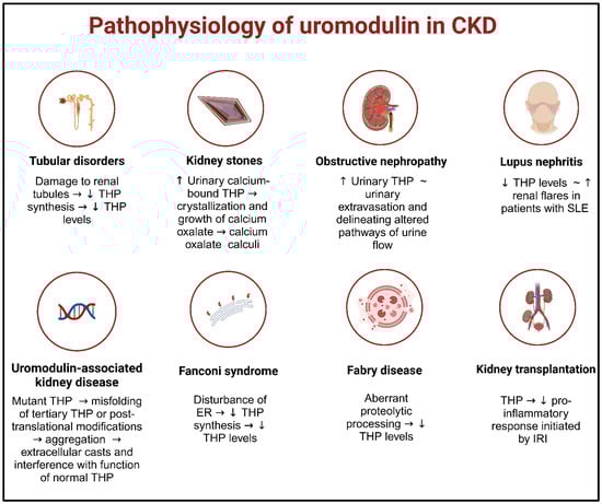 Overview of the role of uromodulin in chronic kidney disease. Abbreviations: CKD: chronic kidney disease; THP: Tamm-Horsfall protein; SLE: systemic lupus erythematosus; VUR: vesicoureteral reflux; ER: endoplasmic reticulum; IRI: ischemia-reperfusion injury.