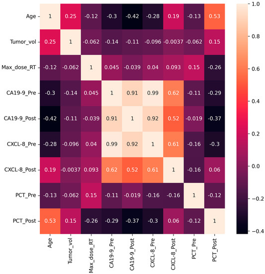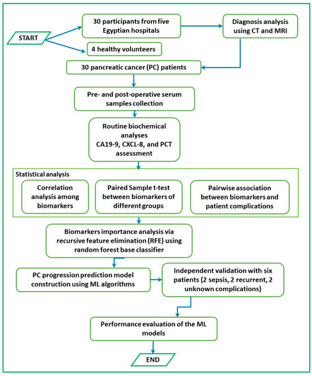 Proceeding from this, the aim of the current study was to develop a risk assessment ML-based model, based on demographic and clinical variables, as well as several accessible and cost-effective biomarkers, including CA 19-9, CXCL-8, and PCT. The proposed ML model attempts to predict risk factors for POCs including sepsis/septic shock, recurrence, or death from unknown complications among PDAC patients admitted to the ICU. The plausible clinical relevance of the ML-based prediction of POCs among PDAC patients resides in its ability to direct clinical decision making and to handle postoperative events by directing their predictions to estimate and guide optimal treatment, to minimize the complications’ impact, and to shed light on relevant risk factors in forthcoming patients.